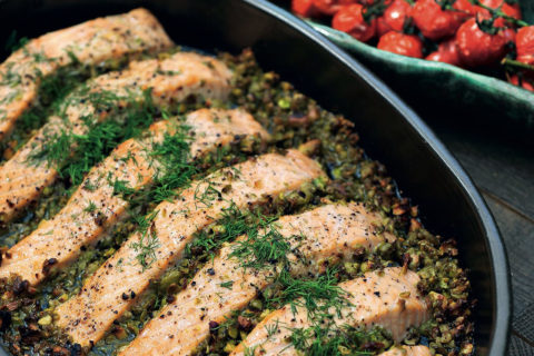 Salmon with olive-pistachio tapenade & tomatoes