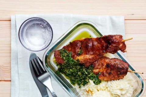 Pork Skewers with Cauliflower Mash and Salsa Verde