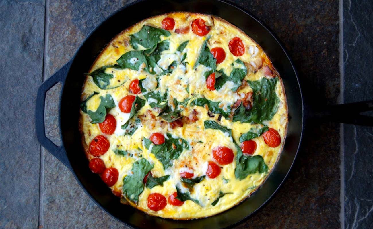 2. Add in onions and cook until they begin to caramelize, stirring occasionally. Add in the tomatoes and kale or chard, cook for about 30 seconds, and pour the egg mixture over the other ingredients.