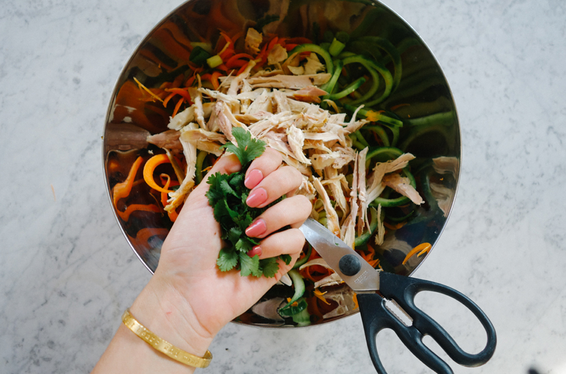 1. Start by turning your carrots and cucumber into noodles/ribbons — use a spiraliser. Pop them into a large bowl.