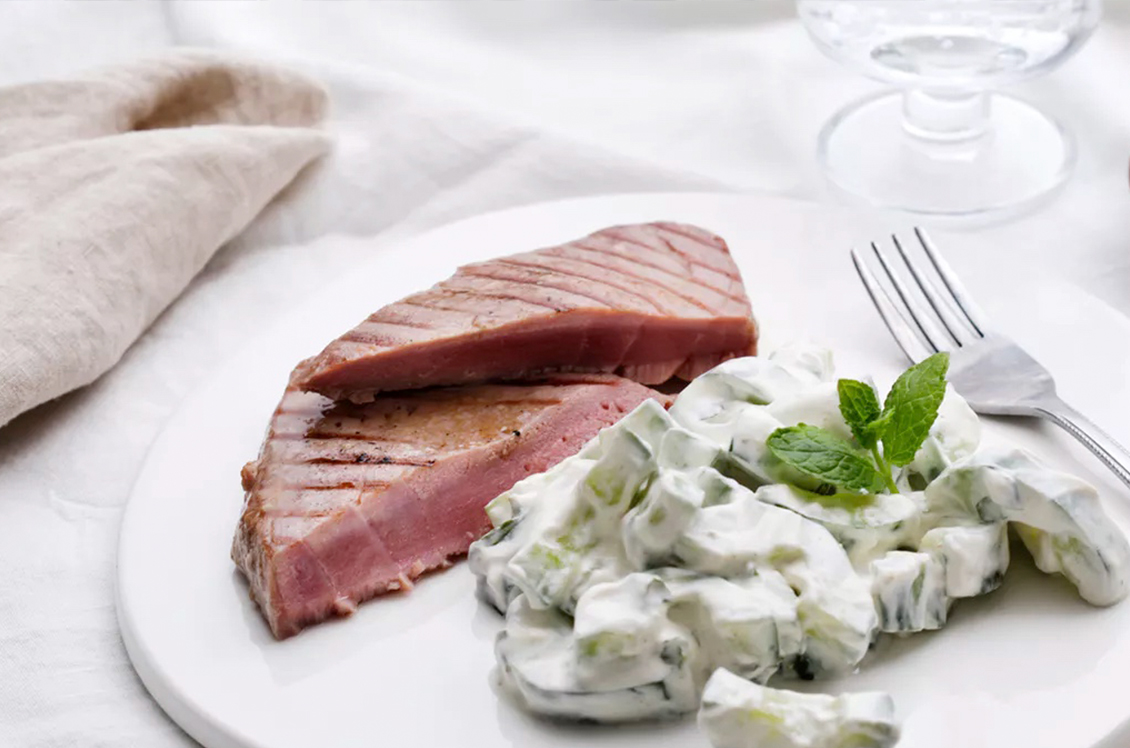 - Grill or fry over high heat for about 2 minutes on each side, depending on its thickness. Tuna is best served with a pink center so be careful not to overcook it.