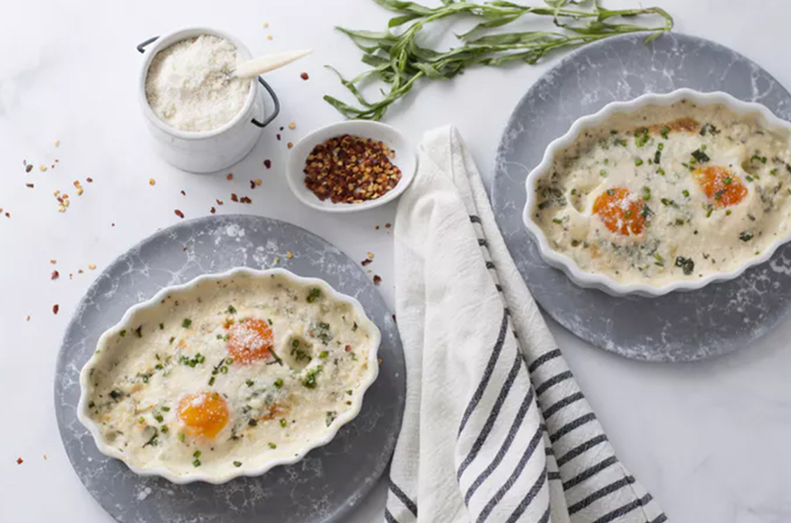 - Combine the heavy cream, cheese, garlic, tarragon, chives, salt, pepper, and nutmeg. Whisk until all ingredients are well incorporated. Divide the mixture evenly between the prepared ramekins.