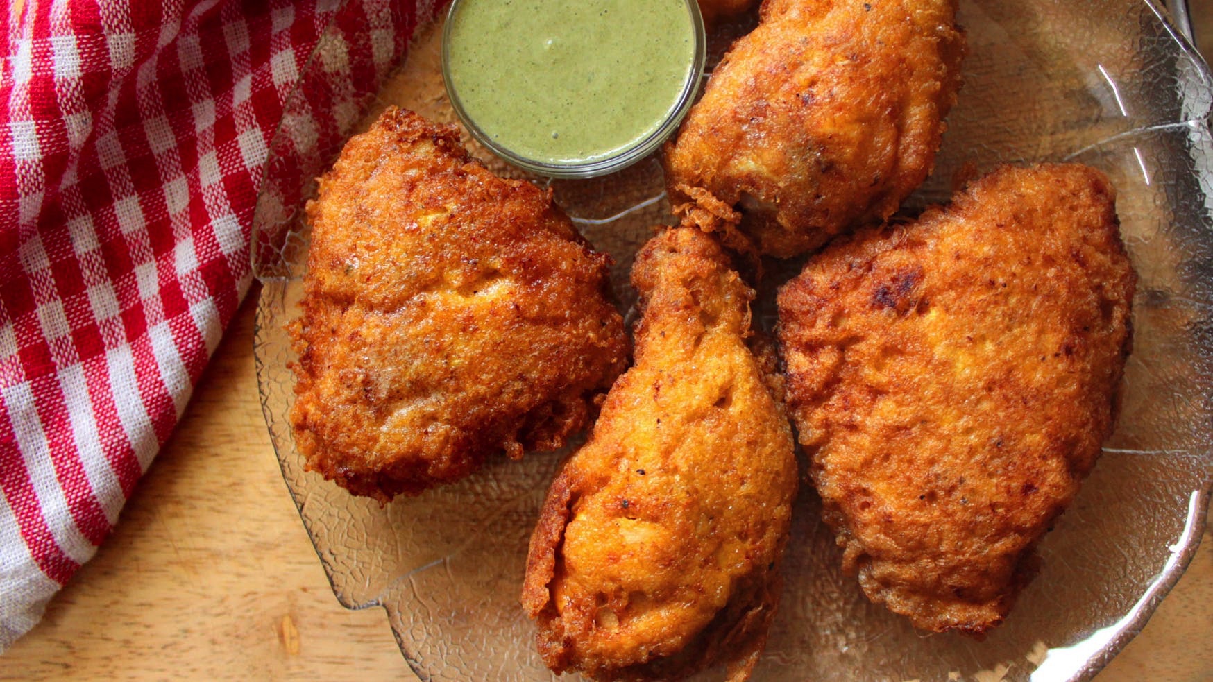 Chicken farcha is the lacy Indian equivalent of the American Southern fried chicken, mildly spiced and highly delicious. Let’s dump the traditional breadcrumbs, ditch the carbs and keep the crisp. Serve this ultimate keto fried chicken as an appetiser or main dish with a green chutney dip.