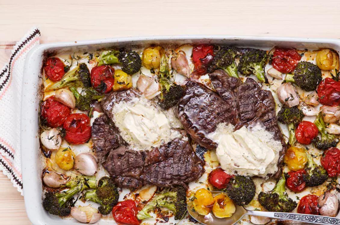 Keto ribeye steak with oven-roasted vegetables