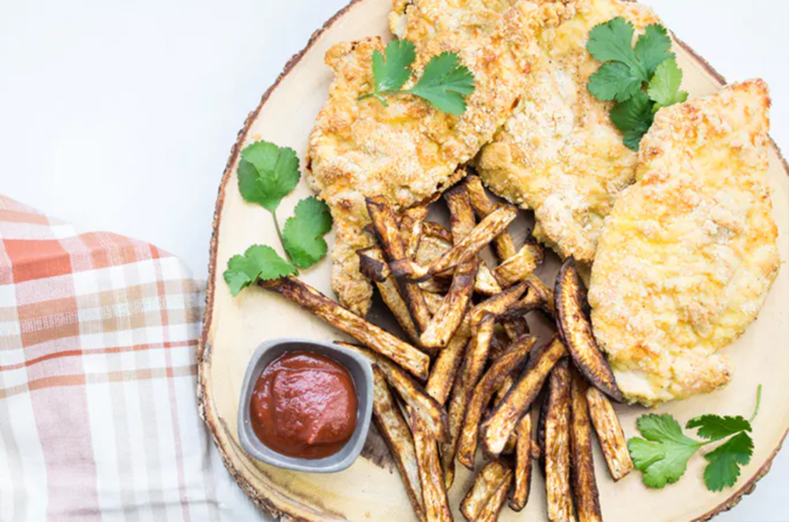 Low-carb chicken Milanese with turnip fries