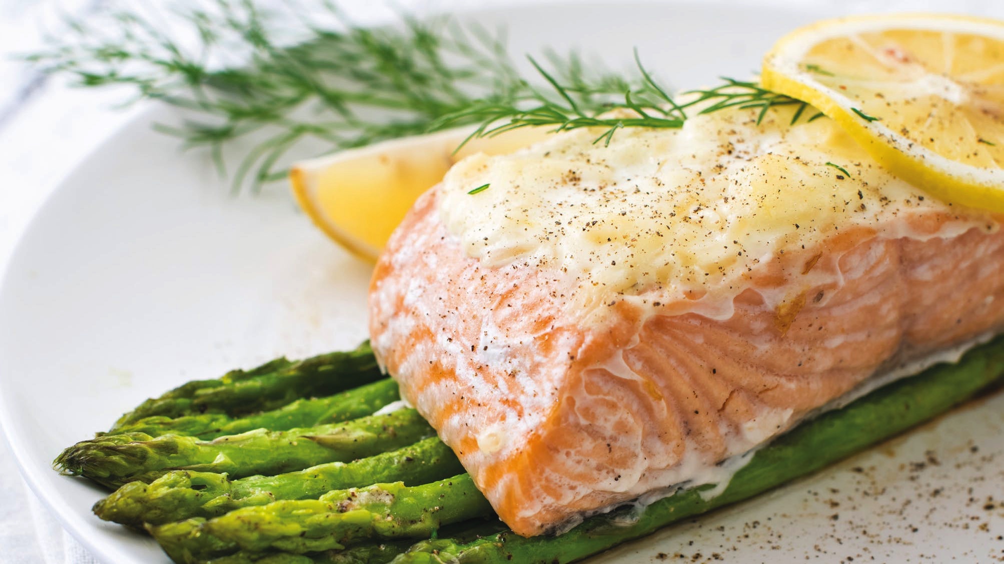 6. Place the fillets on top of the asparagus, skin side down. Top the salmon with the mayonnaise mixture.