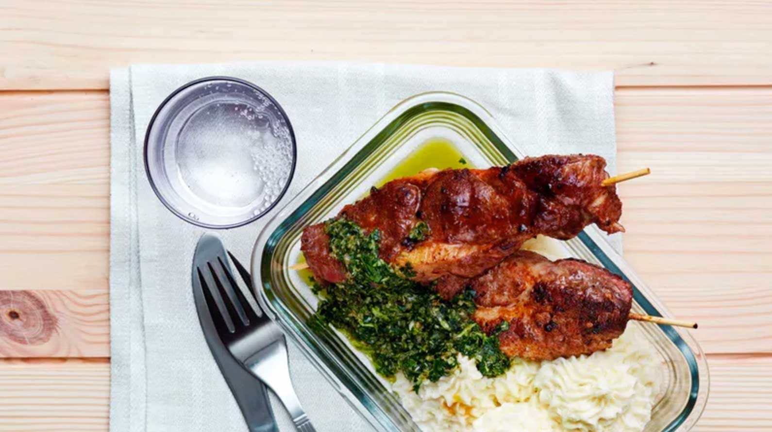 Pork Skewers with Cauliflower Mash and Salsa Verde