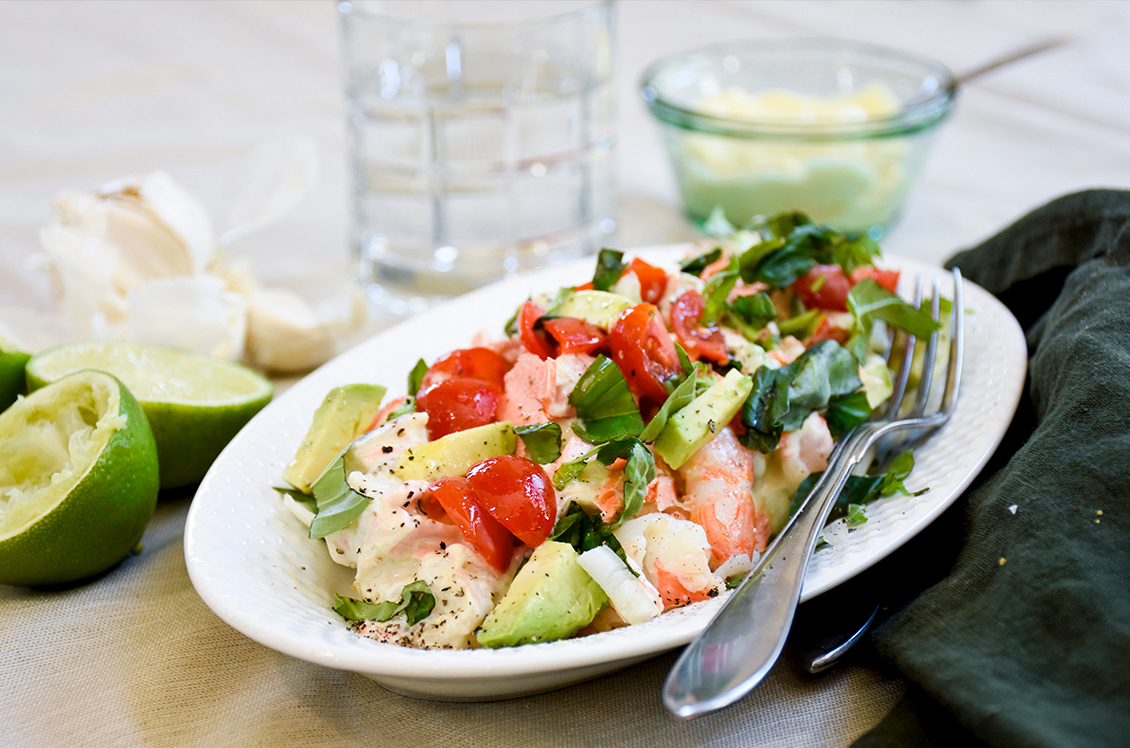 A fresh and tasty seafood salad with shrimp and salmon that are excellent sources of protein. When avocado, mayonnaise and sour cream are added, the combination of healthy fats make this an excellent low carb meal.